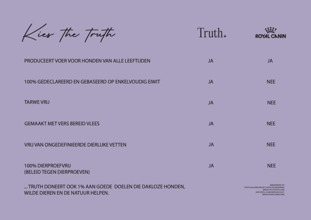 The Truth staat op tegen andere grote bedrijven en is transparant over de ingrediënten. In de onderstaande vergelijking ziet u waar ze in uitblinken ten opzichte van andere duurdere en hele bekende merken